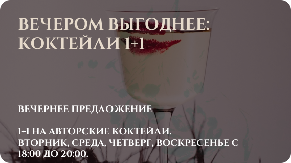Вечернее предложение 1+1 на авторские напитки. Вторник, среда, четверг, воскресенье с 18:00 до 20:00.